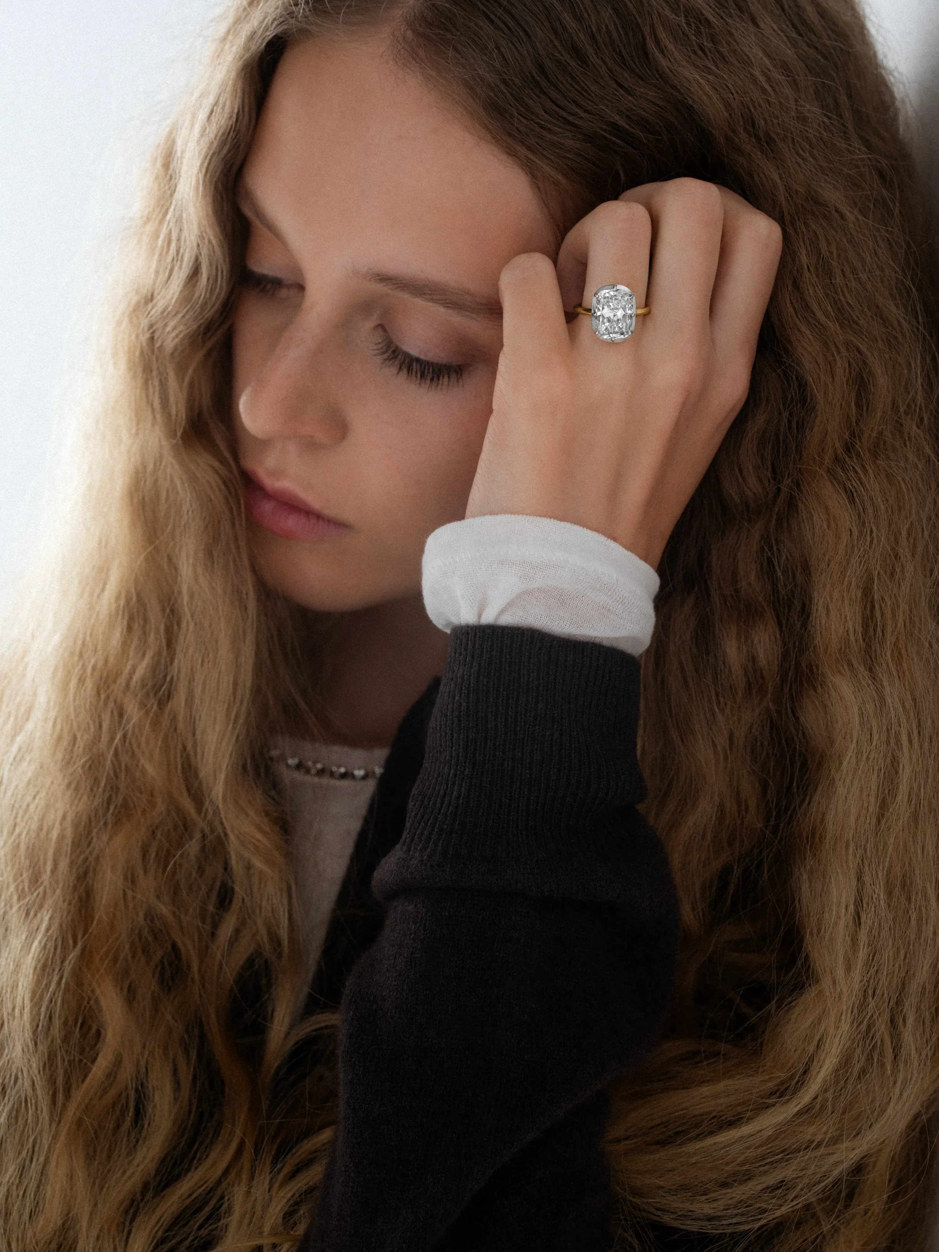 A Diamond Button Back Ring with a 7.01ct Cushion cut diamond, set in a Georgian style cut-down setting in 18K white gold & yellow gold.