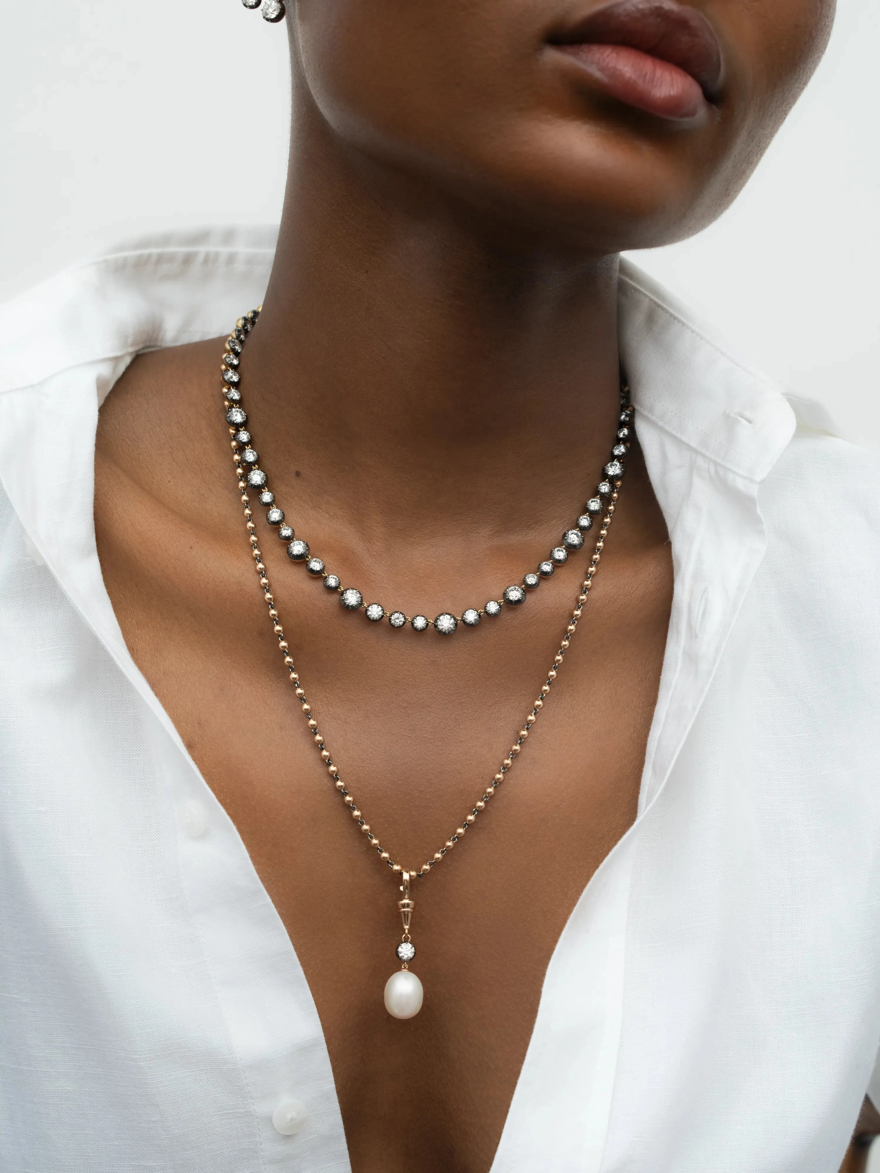 A Ball n Chain Pearl & Diamond Pendant with a 0.40ct Round Brilliant cut diamond & a freshwater pearl, set in a Georgian style cut-down setting in 18K blackened white gold & rose gold.