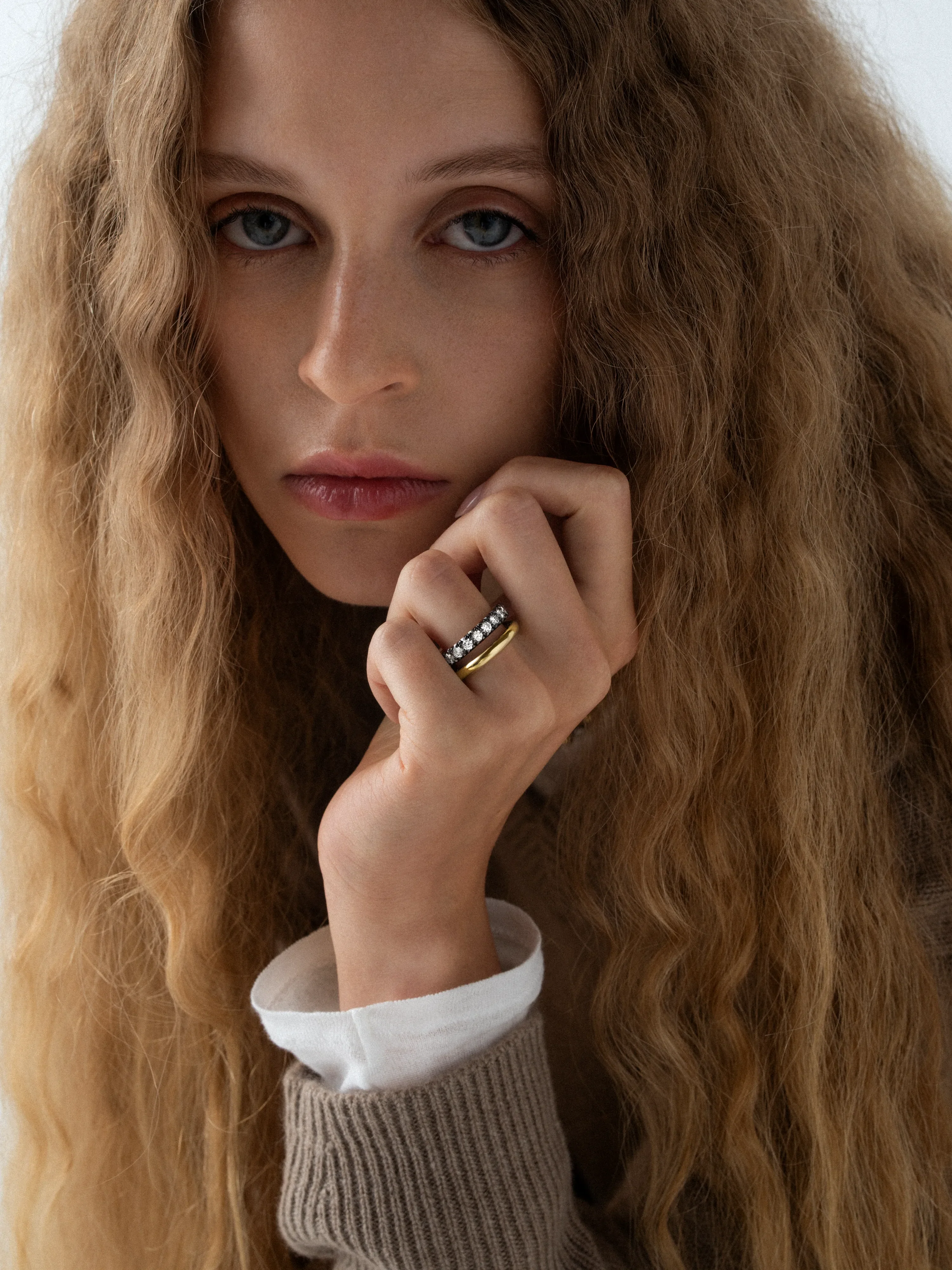 A Medium Cut Down Blackened Gold Band with a set of Round Brilliant cut diamonds, set in a Georgian style cut-down setting, in 18K blackened white gold & yellow gold.