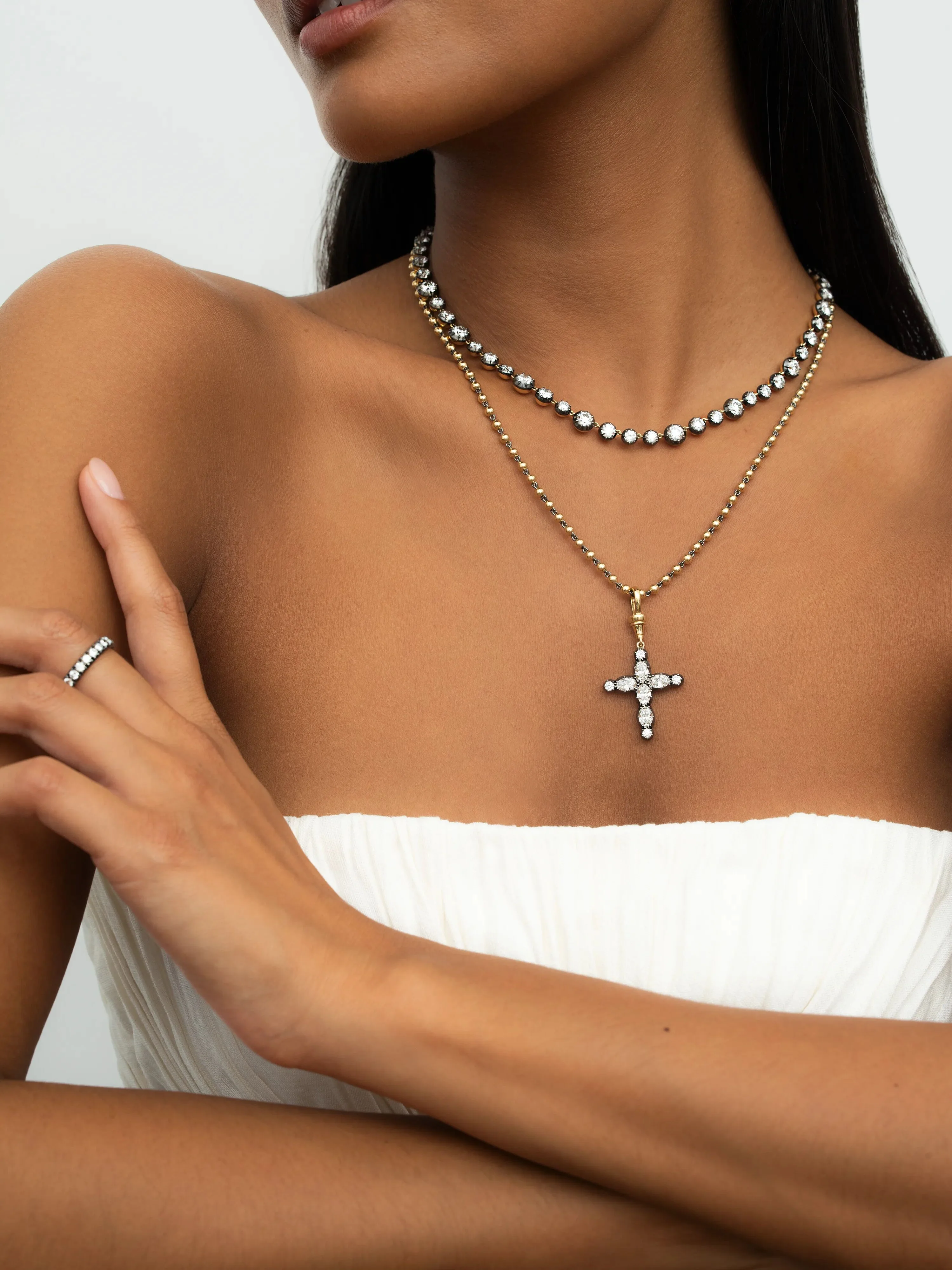 A Oval Cross Diamond Pendant, set with five Oval cut diamonds & four Round Brilliant cut diamonds, set in a Georgian style cut-down setting in 18K blackened white gold & yellow gold.