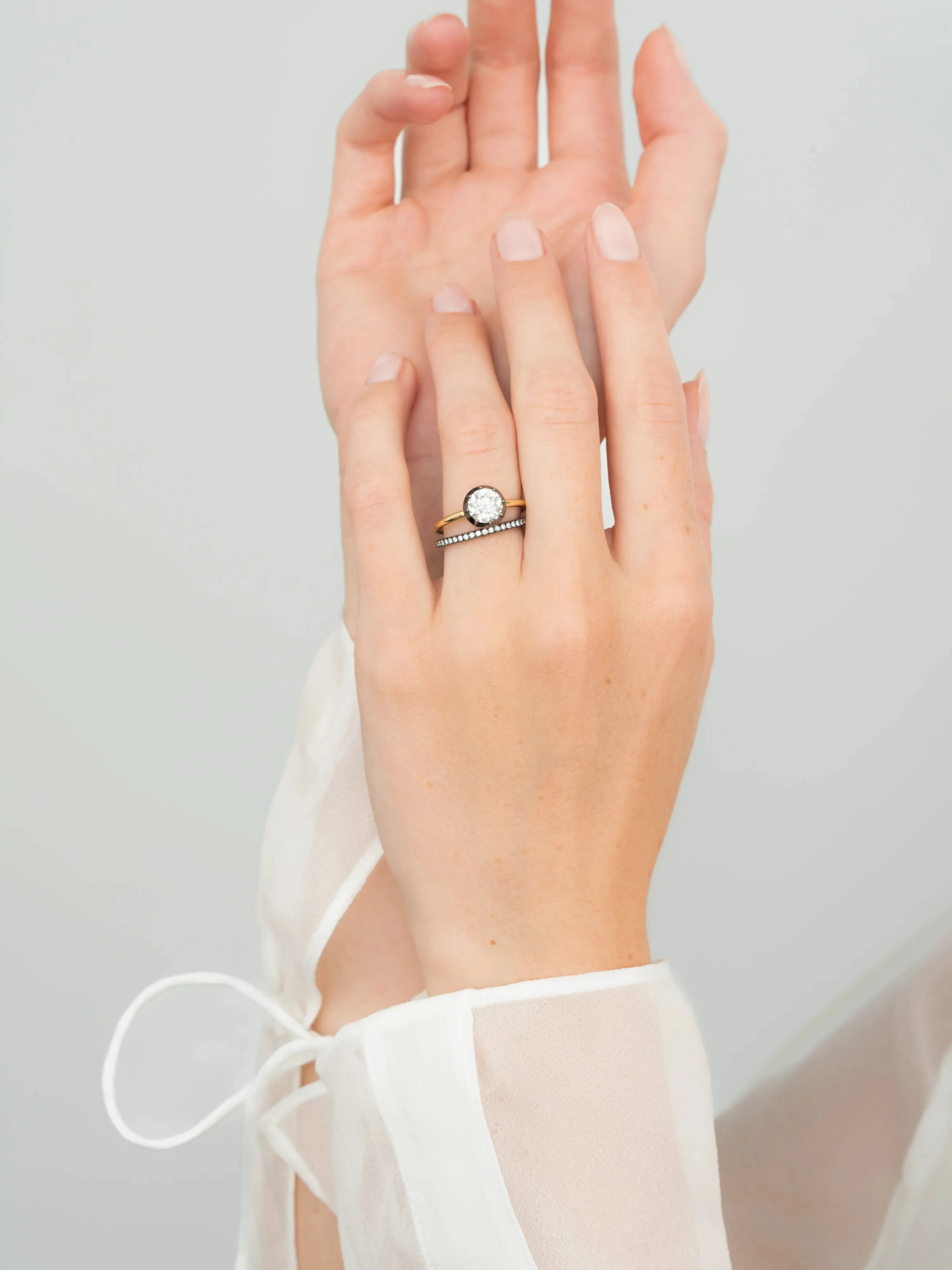 A Diamond & Blackened Gold Button Back Ring with a 1.50ct Round Brilliant cut diamond, set in a Georgian style cut-down setting in 18K blackened white gold & yellow gold.