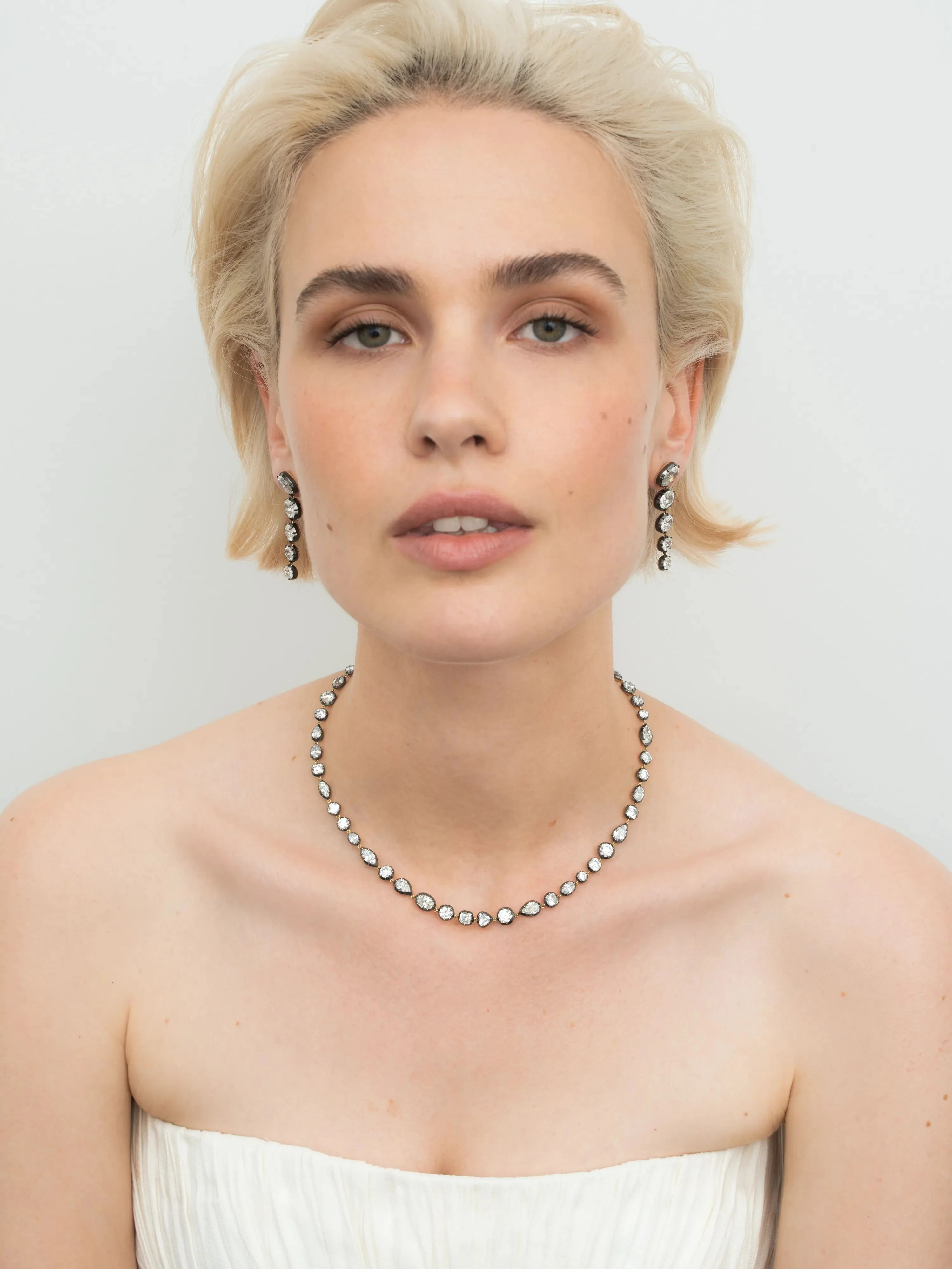 A Signature Multi-Shape Diamond Button Back Necklace with a set of multi-shape diamonds, in a Georgian style cut-down setting in 18K blackened white gold & yellow gold. Total necklace length is 16 inches.