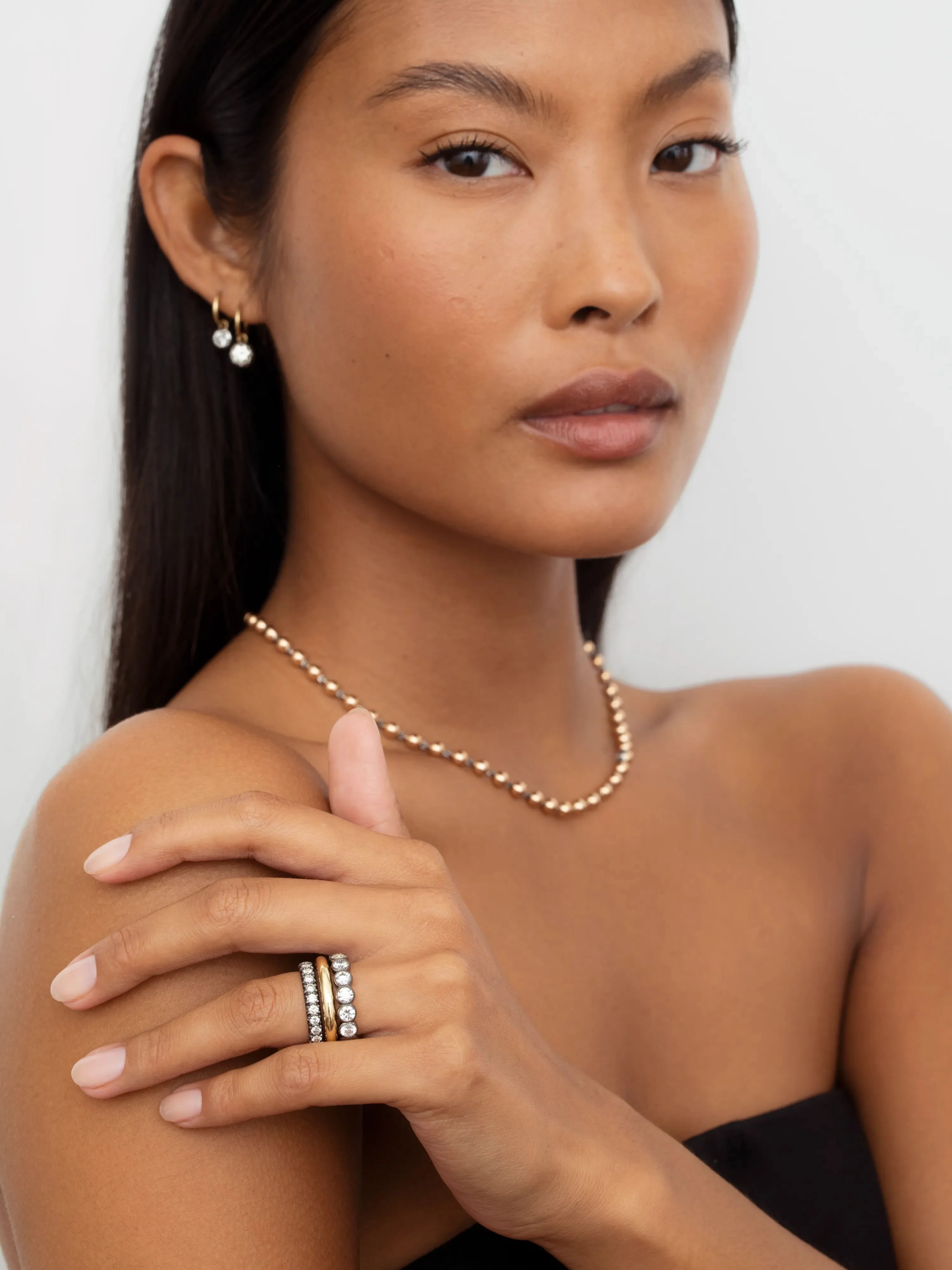 A Small Cut-Down Blackened Gold Band with a set of Round Brilliant cut diamonds, set in a Georgian style cut-down setting, in 18K blackened white gold & yellow gold.